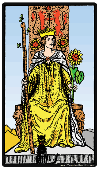 برای درک اینکه کارت تاروت ملکه چوبدستها چه چیزی را توصیف میکند، باید کاملاً بفهمیم که تصویر چه چیزی را نشان میدهد. همانطور که از نامش پیداست، ما شخصیتی مانند یک ملکه را میبینیم که بر تخت خود نشسته است، مغرور و با اعتماد به نفس. تختی که او بر آن نشسته است با شیرها و گلهای آفتابگردان حکاکی شده است که نشان دهنده عمق شخصیت ملکه است. او از کسی نمیترسد و مسیر درست عمل را میداند. او آماده است تا در صورت لزوم مسئولیت موقعیتی را در قلمرو خود بر عهده بگیرد.