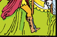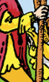 رنگ زرد طلایی که به عنوان زیرینۀ لباس سوارکار دیده میشود، نماد نابِ “نور آگاهی، خرد ذهنی و روشنایی درون” است. این رنگ نشان می دهد که پیروزی که بدست آمده بر مبنای ژرف اندیشی ودرک عمیق از موقعیت بنا شده است.ب