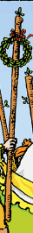 سوارکار تنها یک چوبدست را به صورت برافراشته در دست راست خود نگه میدارد زیرا این چوبدست، نماد “خودِ پیروزی”، کامیابی نهایی و تمرکز انرژی است. این چوبدستِ واحد، همان کارت ششم است که به عنوان نقطه اوج و نتیجه نهایی از میان پنج چوبدست قبلی (نماد چالشها و نزاعهای کارت پنج) سر برآورده است. برافراشته کردن تنها یک چوبدست، یک ژست قدرتمندِ اعلام پیروزی است (مانند برافراشتن پرچم پس از فتح یک قلعه) که بر وحدت هدف، اعتماد به نفس مطلق و روشنیِ موفقیت تأکید میگذارد. پنج چوبدست دیگر در دست چپ او، صرفاً پشتیبانان و پایههای این پیروزی هستند، اما این یک موفقیتِ واحد و باشکوه است که همه نگاه ها را به خود جلب کرده است.