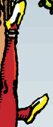 شلوار قرمز که پایینتنه را پوشانده، نماد انرژی زمینی، ارادهٔ مهارشده و شور زندگی محبوس است. قرمز، رنگ ریشهها، غرایز و عمل در جهان مادی است. پوشیدن آن به صورت شلوار (و نه پیراهن) نشان میدهد که این انرژی حیاتی و اراده، محدود، مسدود یا جهتدار شده است. این نماد به وضوح بیانگر این مفهوم کلیدی کارت معلق است: “ایستادن آگاهانه در مکث”. انرژی برای عمل وجود دارد، اما عمداً و به خاطر یک هدف بالاتر، در حال حاضر مهار شده است.