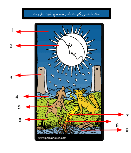 کارت کبیر ماه یکی از کارت های اسرار آمیز در سری کارت های تاروت کبیر می باشد نمادهایی که در این کارت رسم شده است مفاهیم عمیق و چندلایه است که به ناخودآگاه، توهم، شهود، ترسها و ابهامات درونی اشاره دارد. در ادامه، عناصر مهم این کارت و نمادهای آن بررسی میشود: