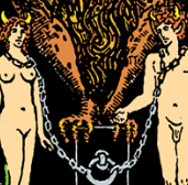 کارت کبیر دیو تصویری از یک  اهریمن را نشان می دهد که دو زن و مرد رابه زنجیره کشده است